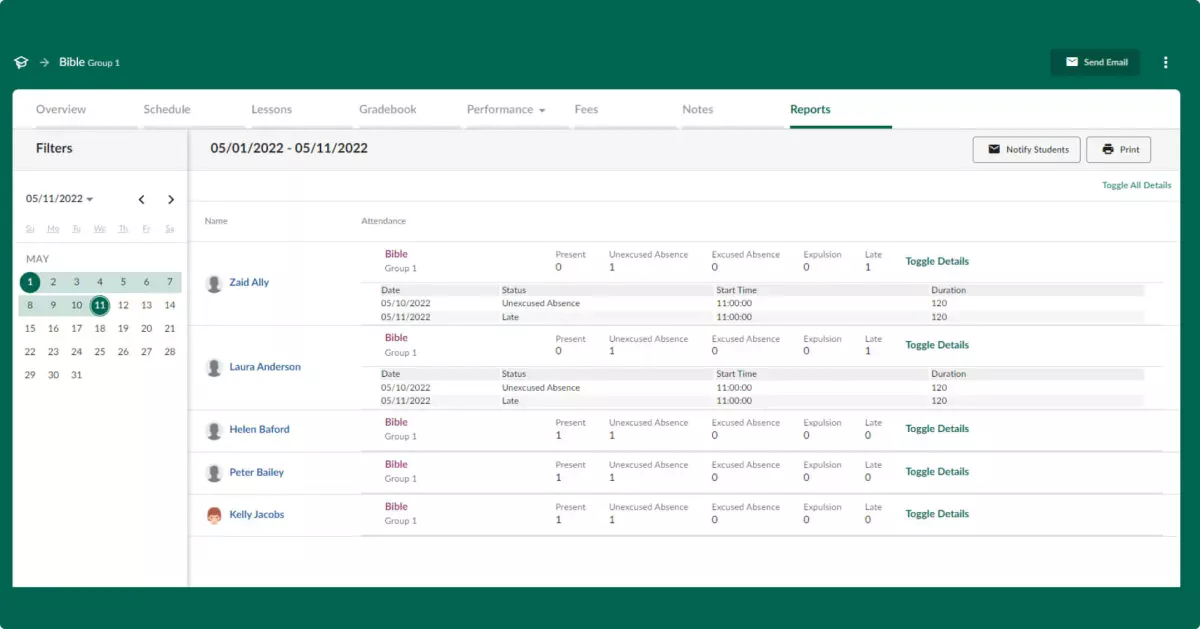 Easy, online — even remote — attendance management allows for absolute control of your classes, avoiding accidental omissions or tedious, error-prone processes. Attendance may also be delegated to teachers, reducing costs and overhead. Instantly share attendance data and immediately notify parents and guardians.