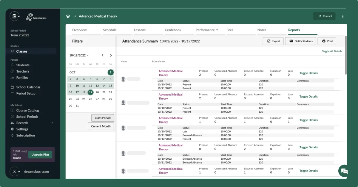 Get absolute control of your classes, avoiding accidental omissions or tedious, error-prone processes, with easy, online — even remote — attendance management. Reduce costs and overhead, by delegating attendance to teachers. Share attendance data and immediately notify parents and guardians, in an instant.