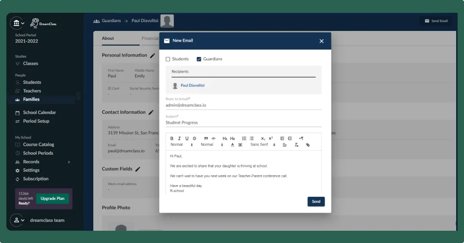 Get in touch with parents and guardians in moments, with emails and notifications. Keep them posted of every important bit of information; including kids’ performance and their wellbeing.